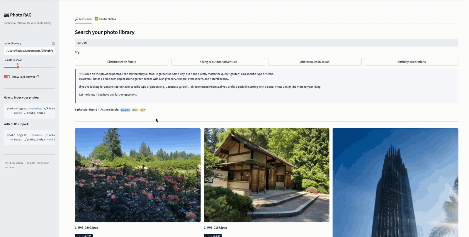 Here’s a short demo of the app in action. In this example, the user searches for “garden” — and the results show how hybrid retrieval pulls photos from multiple signals. Some photos match because the vision model caption describes a garden scene (semantic match via visual content). Others match because their reverse-geocoded location includes “Garden Grove” (lexical match via BM25). This is exactly the kind of complementary retrieval that the hybrid approach enables — neither signal alone would have surfaced all of these results:
